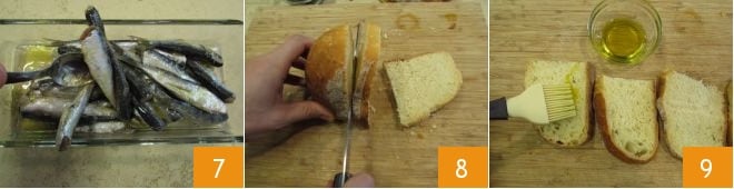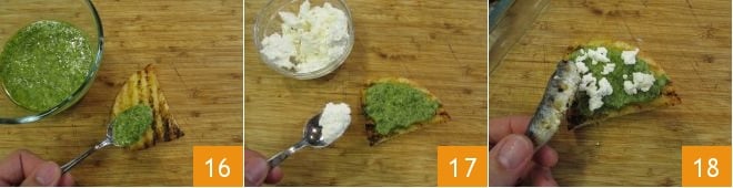 À ce stade, tout est prêt pour procéder à la composition des bruschettes : sur les tranches de pain, versez un peu de pesto 16, ajoutez quelques miettes de ricotta 17 et ensuite une paire de sardines 18.