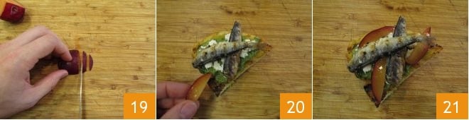 Pour finir, garnissez les bruschettes au pesto d'herbes et sardines grillées avec des tranches de prune 19, que vous pouvez disposer sur les tranches de pain 20. Voilà votre entrée prête, bon appétit 21 !