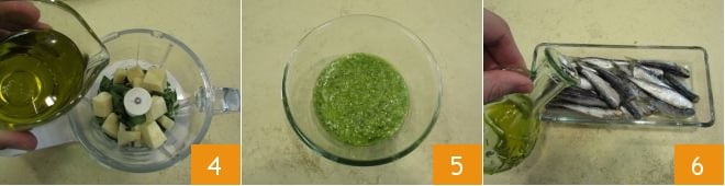 et enfin l'huile 4. Actionnez les lames jusqu'à obtenir un pesto crémeux, versez-le dans un bol et mettez-le un moment de côté 5. Passez aux sardines : si vous souhaitez les nettoyer vous-même, vous pouvez suivre nos conseils sur Comment nettoyer les anchois. Versez-les dans un récipient et arrosez avec quelques cuillères à soupe d'huile 6,