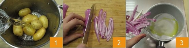 Pour réaliser les burgers de pommes de terre, commencez par mettre les pommes de terre dans une casserole, couvrez-les d'eau 1 et faites-les cuire environ 40 minutes ou jusqu'à ce qu'elles soient tendres. Épluchez les oignons et émincez-les 2, faites chauffer l'huile d'olive dans une cocotte et ajoutez les oignons 3,