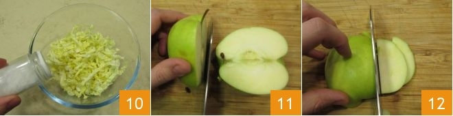 Placez le chou dans un bol, salez-le 10 et laissez-le reposer environ 30 minutes, ainsi il deviendra plus tendre et libérera ses liquides. Entre-temps, lavez et séchez les pommes, coupez-les d'abord en deux 11, puis en fines tranches 12;