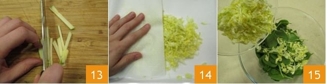 réduisez chaque tranche en bâtonnets 13 et mettez-les de côté. Maintenant, séchez le chou avec un chiffon 14. Tout est prêt pour composer la salade : dans un bol, versez les pousses d'épinard lavées et séchées, ajoutez le chou 15,