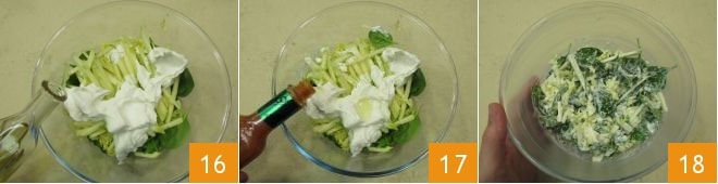 les pommes, le yaourt, l'huile d'olive 16 et quelques gouttes de tabasco 17. Mélangez pour assaisonner et réservez 18.