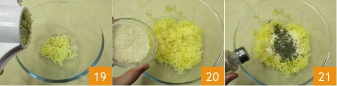 Quand les pommes de terre sont prêtes, mettez-les encore chaudes et avec la peau dans le presse-purée, en recueillant la purée dans un grand bol 19. Ajoutez également le fromage râpé 20, le hachis d'herbes, salez et poivrez 21.