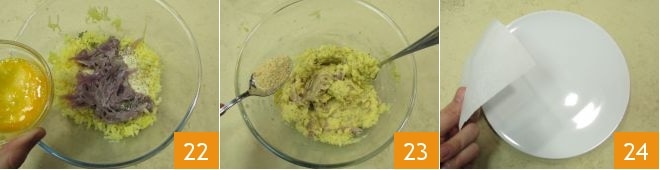 Ajoutez aussi les oignons mijotés, l'œuf battu 22, puis ajoutez une cuillère à soupe de chapelure à la fois jusqu'à obtenir un mélange compact 23; la pâte peut en nécessiter plus ou moins selon la consistance du mélange. Tout est prêt pour former les burgers : découpez un carré de papier sulfurisé d'environ 12 cm de côté et posez-le sur une petite assiette 24.