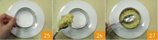 Placez au centre de la feuille un emporte-pièce rond de 10 cm de diamètre 25, insérez à l'intérieur de l'emporte-pièce la pâte 26 et pressez-la bien avec le dos de la cuillère 27.