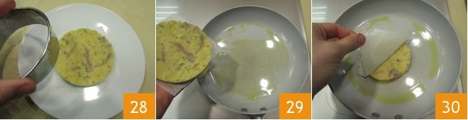 Retirez délicatement l'emporte-pièce : vous obtiendrez ainsi votre burger 28. Maintenant, passez à la cuisson : faites chauffer une poêle avec un filet d'huile d'olive, déposez le burger en le soulevant avec le papier pour qu'il reste compact 29. Une fois posé sur la poêle, retirez le papier sulfurisé 30.