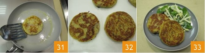 Faites cuire les burgers 3 minutes d'un côté et 2 minutes de l'autre 31, ils doivent être dorés en surface 32. Servez immédiatement les burgers de pommes de terre chauds en les accompagnant de la salade au yaourt 33.