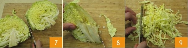 Pendant ce temps, préparez la salade : divisez le chou en deux 7, retirez la côte centrale dure 8, puis coupez-le en fines lanières 9.