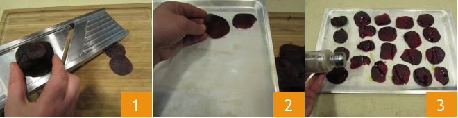 Assaisonnez avec de l'huile, du sel et du poivre et faites cuire comme précédemment 7. Ensuite, répétez les mêmes étapes pour les pommes de terre. Lavez-les soigneusement, puis séchez-les, pelez-les et obtenez des disques fins - d'une épaisseur de 1-2 mm - à l'aide de la mandoline 8. Disposez-les sur la plaque de cuisson avec du papier sulfurisé 9,