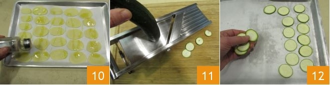 assaisonnez avec de l'huile, du sel et du poivre et enfin, faites cuire au four à 150°C pendant environ 35 minutes, jusqu'à ce qu'elles deviennent croustillantes 10. Pour terminer, vous pouvez vous occuper des courgettes. Lavez-les, séchez-les et ôtez les extrémités. Puis, tranchez-les 11 et disposez-les sur la plaque de cuisson avec du papier sulfurisé 12