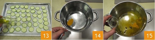 et faites-les cuire aussi pour le temps indiqué ou en tout cas jusqu'à ce qu'elles soient croustillantes 13. Entre deux fournées, vous pouvez vous occuper du reste. Mettez une casserole d'eau sur le feu puis ajoutez le curcuma 14, les baies de genévrier, le poivre en grains 15,