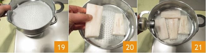 Passé ce temps, prenez les filets de cabillaud et rincez-les sous un filet d'eau froide puis séchez-les avec du papier absorbant. Montez un cuiseur vapeur sur la casserole et tapissez le fond de papier sulfurisé 19, puis placez les filets de cabillaud 20, assaisonnez de sel et de poivre 21