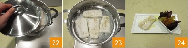 et couvrez avec le couvercle 22. Cuisez ainsi pendant environ 15 minutes à feu doux 23. Lorsqu'ils sont cuits, disposez les filets de cabillaud à la vapeur de curcuma avec chips de légumes sur un plat de service, avec les chips disposées dans un bol, et dégustez le poisson encore chaud, garni d'un filet d'huile 24 !