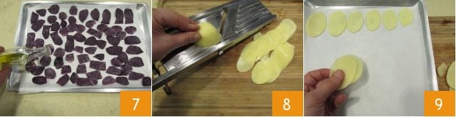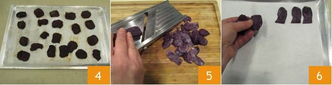 et enfournez pendant 35 minutes ou jusqu'à ce qu'elles soient sèches et croustillantes 4. Faites de même avec les pommes de terre violettes. Ensuite, pelez-les, tranchez-les 5 et disposez-les sur la plaque de cuisson avec du papier sulfurisé 6.