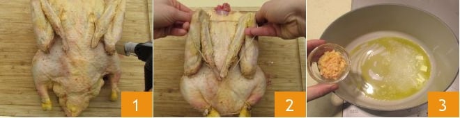 Pour préparer le canard à l'orange, procurez-vous un canard déjà nettoyé des entrailles, du gras et des plumes éventuellement, sinon vous devrez le nettoyer soigneusement avant de l'utiliser dans la recette. Retirez les plumes éventuellement restantes en les brûlant avec un chalumeau 1, puis rincez-le bien sous l'eau courante à l'intérieur et à l'extérieur et séchez-le parfaitement avec un linge de cuisine. Passez à la ligature: en vous aidant d'une ficelle élastique pour aliments (disponible dans n'importe quel magasin de maison), nouez les ailes en passant par les épaules et en passant sur le ventre, attachez également les pattes 2. Cela servira à bien maintenir la forme du canard entier pendant la cuisson. Dans une grande poêle, faites chauffer l'huile, puis ajoutez le gras de canard mis de côté 3, faites-le mijoter pendant quelques minutes.