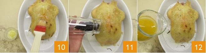 Brossez ensuite le canard avec les 40 g de beurre fondu 10, salez-le, poivrez-le 11 et versez environ 50 g de jus d'orange au fond du plat 12