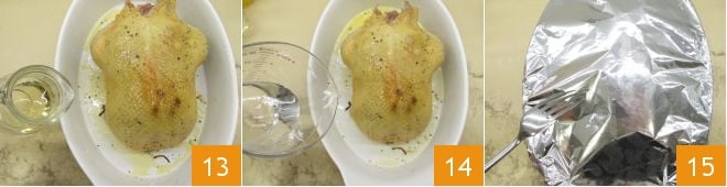 le vin blanc 13 et 20 g d'eau 14. Avant de le transférer au four, couvrez le canard avec une feuille d'aluminium que vous perforez avec les dents de la fourchette 15 pour faciliter la cuisson et éviter que la surface de votre canard ne brûle. Transférez au four statique préchauffé à 200° et faites cuire le canard avec l'aide d'une sonde jusqu'à ce qu'il atteigne 70° au cœur : environ 1 heure et 10 minutes seront nécessaires.