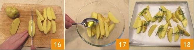 Préparez également les pommes de terre qui iront au four séparément mais à la même température que le canard : lavez-les soigneusement et nettoyez-les avec un linge de cuisine, puis coupez-les en quartiers éventuellement égaux, en laissant la peau 16; assaisonnez-les dans un bol avec de l'huile 17, du sel et du poivre. Ensuite, transférez-les sur une plaque recouverte de papier sulfurisé et aromatisez avec du romarin 18. Placez-les au four avec le canard (vous pouvez les positionner sur la grille inférieure du four); elles devront cuire à la même température pendant environ 30 minutes.
