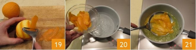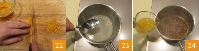 et coupez-les en fines lanières 22. Préparez la sauce en dissolvant le sucre avec l'eau à feu très doux 23 : vous devrez atteindre la température de 166° mesurée avec un thermomètre de cuisine et à ce moment-là, versez le jus d'orange filtré 24;