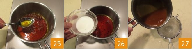 mélangez avec un fouet pour émulsionner le tout et ajoutez quelques cuillères du fond de cuisson du canard 25 et l'amidon de maïs dilué dans 20 g d'eau 26. Continuez à travailler la sauce avec le fouet jusqu'à ce qu'elle épaississe, puis éteignez et filtrez la sauce à travers une passoire 27,