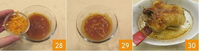 puis ajoutez les zestes d'orange finement tranchés (28-29) et réservez. Une fois la température atteinte au cœur, retirez le canard du four, enlevez le papier d'aluminium, brossez-le avec la sauce à l'orange 30 et passez-le environ 5/10 minutes au gril (le temps varie selon la puissance du four) pour bien le dorer.
