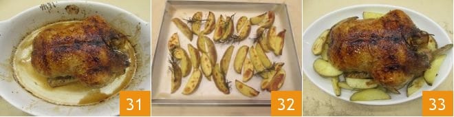 Une fois doré, sortez votre canard 31 et les pommes de terre qui seront cuites 32, servez le canard à l'orange sur un plat de service avec les pommes de terre 33 et utilisez la sauce à l'orange pour arroser les tranches que vous servirez à vos invités.
