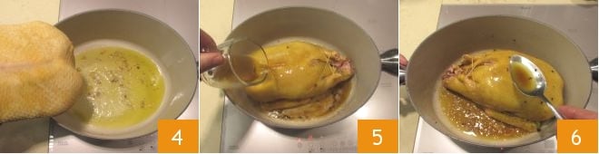 Déposez le canard et faites-le dorer à feu moyen d'un côté 4 puis de l'autre; ensuite déglacez avec le Grand Marnier 5 et arrosez avec le fond de cuisson 6.