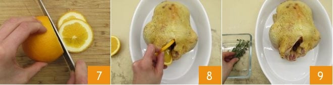 Entre-temps, coupez les oranges en tranches 7 et lorsque le canard sera bien doré, transférez-le dans un plat allant au four à bords assez hauts et remplissez-en l'intérieur avec trois tranches d'orange 8, du thym et du romarin 9.