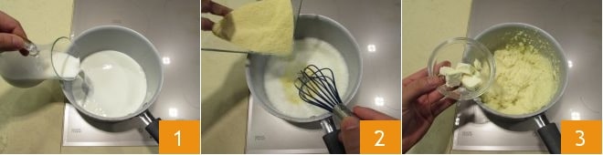 Pour préparer les quenelles de semoule, commencez par préparer le Bouillon de viande. Ensuite, passez à la pâte : dans une casserole à fond antiadhésif et à bords hauts, faites chauffer le lait 1 jusqu'à ce qu'il frôle l'ébullition. Ajoutez ensuite la semoule en pluie 2 en remuant constamment et vigoureusement avec un fouet à main pour éviter la formation de grumeaux, pendant environ 7-8 minutes. Puis éteignez le feu et ajustez le sel. Ajoutez maintenant le beurre ramolli 3,