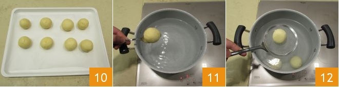 Disposez les quenelles bien espacées les unes des autres sur un plateau recouvert de papier sulfurisé afin qu'elles ne collent pas 10. Portez maintenant à ébullition une grande casserole d'eau salée et, lorsqu'elle est à ébullition, plongez-y 4-5 quenelles à la fois 11 : vous les verrez tomber au fond de la casserole. Dès qu'elles remontent à la surface, elles sont prêtes : à l'aide d'une écumoire, égouttez-les 12. Cuisez également le reste,