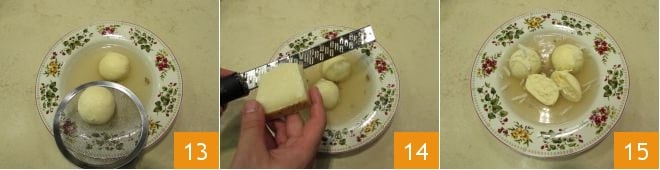 puis prenez les assiettes de service pour les quenelles de semoule et versez du bouillon de viande. Ensuite, avec l'écumoire, transférez environ 2-3 quenelles par portion dans chaque assiette 13. Saupoudrez de fromage 14 et dégustez vos quenelles de semoule encore chaudes 15!