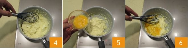 continuez à remuer pour qu'il fonde dans le mélange chaud 4, puis versez un œuf battu 5. Incorporez-le également aux ingrédients 6.
