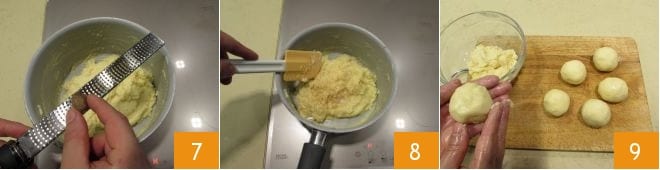Aromatisez avec la noix de muscade 7 et continuez à remuer : le mélange doit avoir une consistance épaisse et compacte et se détacher des bords de la casserole 8. Laissez-le maintenant tiédir pour qu'il se compacte. Lorsqu'il est à température ambiante, prélevez-en environ 65 g et, avec les mains légèrement humidifiées, formez une petite sphère 9. Répétez l'opération jusqu'à épuisement de toute la pâte : vous obtiendrez 8 quenelles.