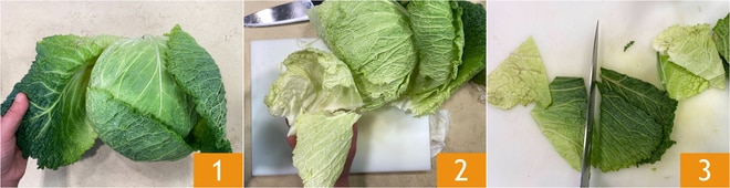 Pour réaliser la cassoeula, commencez par demander de l'aide à votre boucher de confiance pour choisir, couper et nettoyer les parties du porc que vous allez utiliser. Préparez tous les ingrédients, en commençant par le chou : prélevez les feuilles vertes de la partie extérieure du chou 1 et les feuilles blanches du cœur intérieur 2, puis divisez-les en deux 3.