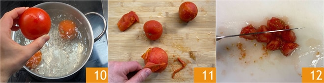 Passez maintenant aux tomates : blanchissez-les brièvement dans l'eau bouillante 10, puis pelez-les 11 et coupez-les en dés 12. Mettez le tout de côté.
