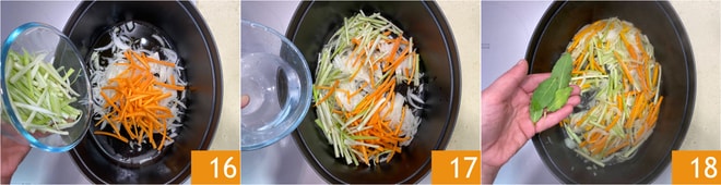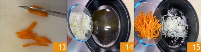 Enfin, épluchez et coupez les carottes en julienne 13, l'oignon et le céleri. Faites chauffer l'huile dans une casserole en fonte, puis ajoutez l'oignon 14 et les carottes 15.