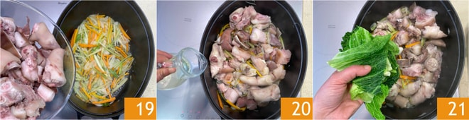 Lorsque les légumes sont ramollis, vous pouvez ajouter le pied, la queue, le museau et l'oreille de porc préalablement blanchis 19. Déglacez avec le vin blanc 20 et laissez évaporer l'alcool, puis ajoutez les feuilles vertes du chou 21.