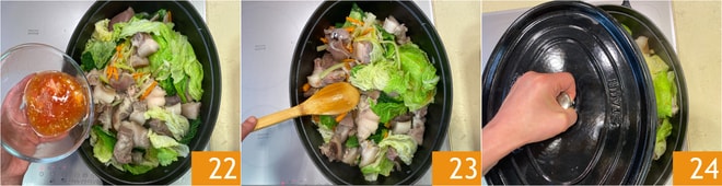 Ajoutez la pulpe des tomates coupées en dés (seulement la partie la plus liquide avec les graines) 22, mélangez 23 et couvrez avec le couvercle 24. Faites cuire pendant une heure et demie à feu moyen-élevé.