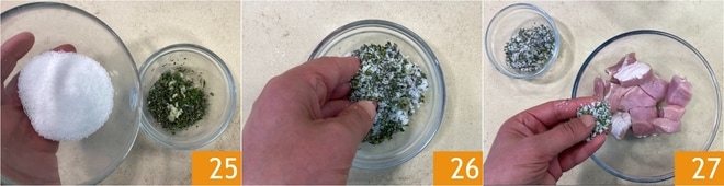 Entre-temps, préparez le sel aromatisé qui vous servira à cuire le rôti et les côtes : hachez finement le romarin, la marjolaine, le persil et l'ail, ajoutez le sel 25 et mélangez bien 26. Assaisonnez le rôti coupé en cubes avec le sel aromatisé, en massant bien chaque morceau 27.