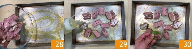 Transférez le rôti dans un plat huilé 28, assaisonnez avec un filet d'huile en surface 29 et parfumez avec une gousse d'ail et une feuille de laurier 30.