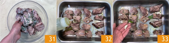 Faites de même avec les côtes préalablement blanchies : massez la viande avec le sel aromatisé 31, puis transférez-les dans un plat huilé et assaisonnez avec un autre filet d'huile 32, du laurier et de l'ail 33. Enfournez les deux plats dans un four statique préchauffé pendant 15 minutes.