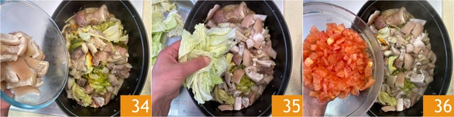 Après une heure et demie, les ingrédients dans la casserole auront commencé à s'amalgamer, vous pouvez donc ajouter les restants : ajoutez la couenne 34 et une couche de feuilles blanches de chou 35, puis versez une partie des tomates en dés 36.