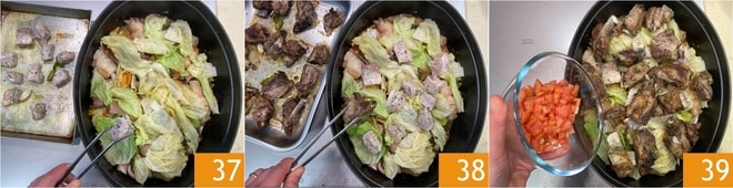Ajoutez également le rôti 37 et les côtes cuites au four 38, sans leur jus de cuisson, puis versez les tomates restantes 39.