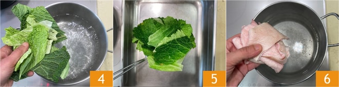 Blanchissez les feuilles vertes dans de l'eau légèrement salée pendant une dizaine de minutes 4, puis égouttez 5 et mettez-les de côté. Faites de même avec les feuilles blanches du chou, en les gardant séparées des vertes. Blanchissez également les morceaux de viande dans de l'eau légèrement salée : plongez la couenne 6 et égouttez-la après 10 minutes.