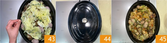 Enfin, ajoutez les verzini 40 et couvrez avec la dernière couche de feuilles blanches de chou 41. Assaisonnez avec une pincée de sel aromatisé et versez un peu d'eau 42.