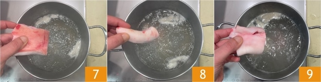 Procédez de la même manière avec l'oreille 7, la queue 8, le pied et le museau 9. Blanchissez également les côtes et les verzini, toujours pendant 10 minutes. Égouttez et mettez de côté.