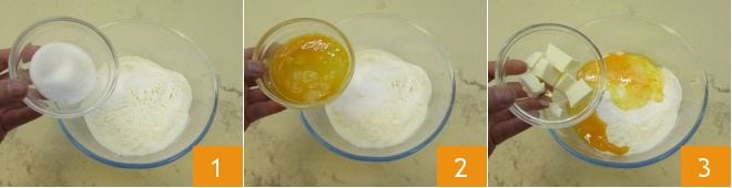 Pour préparer les cassatelles de Carnaval, dans un grand bol versez la farine, le sucre 1, une pincée de sel, les 2 œufs à température ambiante 2, le beurre en morceaux froid mais pas du réfrigérateur 3,
