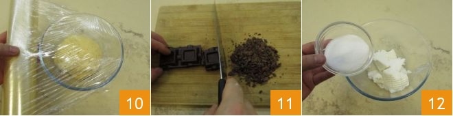 Couvrez-la avec un film plastique 10 et laissez-la reposer 30 minutes hors du réfrigérateur. Pendant ce temps, occupez-vous de la garniture: hachez finement avec un couteau le chocolat noir 11 en veillant à ne pas laisser de gros morceaux qui pourraient percer la pâte pendant la cuisson. Dans un bol, versez la ricotta de brebis, le sucre 12,