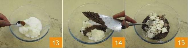 aromatisez avec la cannelle 13 et ajoutez le chocolat haché précédemment 14. Mélangez avec la fourchette pour amalgamer les ingrédients 15.